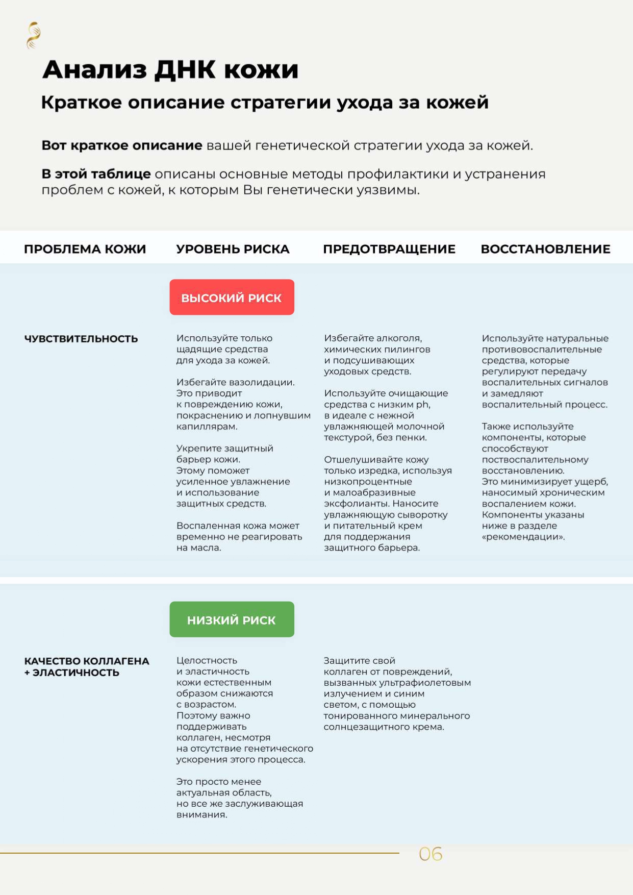 Индивидуальный генетический профиль красоты — это понятный отчет с графиками и диаграммой «Ваша стратегия по уходу за кожей», где наглядно показаны зоны высокого, среднего и низкого генетического риска. Используйте эти данные, чтобы адаптировать свой ежедневный уход и сосредоточиться на том, что действительно важно.